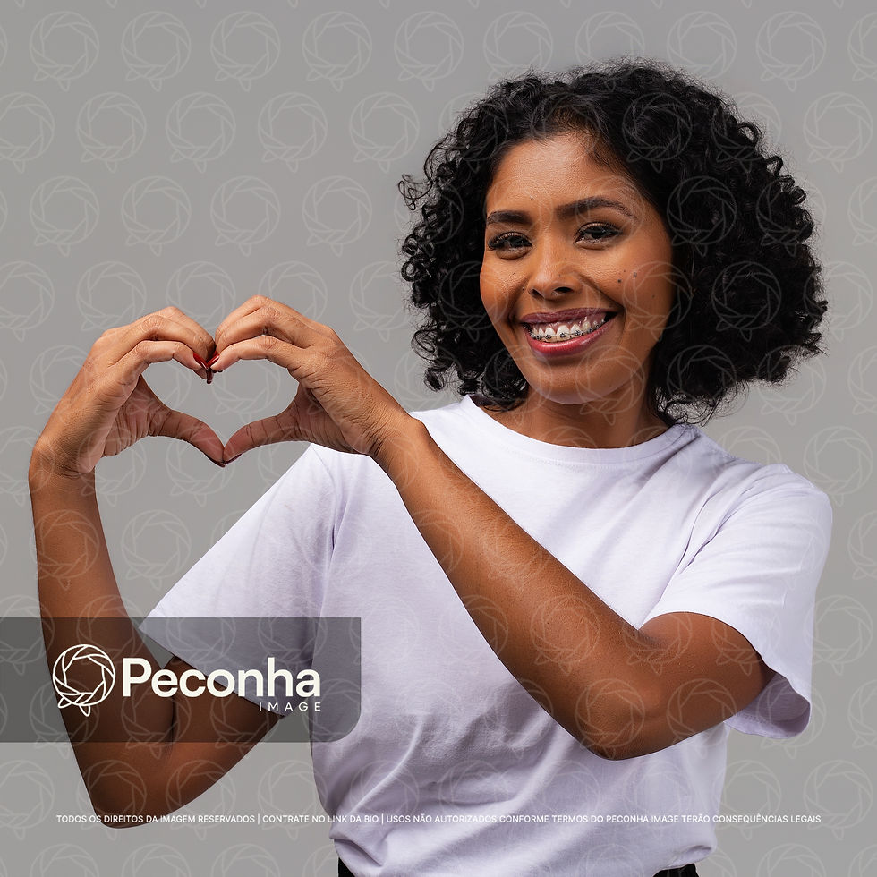 Mulher negra amazônida sorrindo e fazendo gesto de coração com as mãos