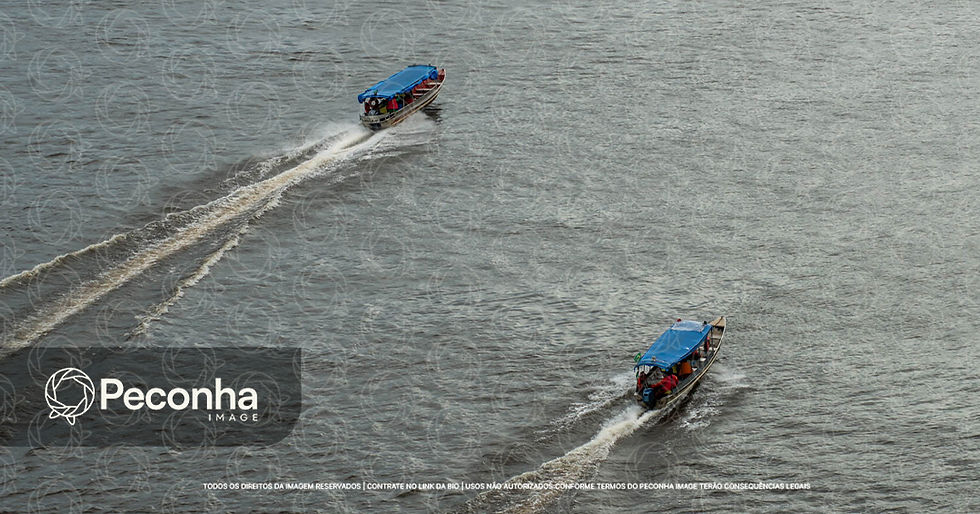 Duas pequenas embarcações com toldos azuis navegam por um rio de águas escuras