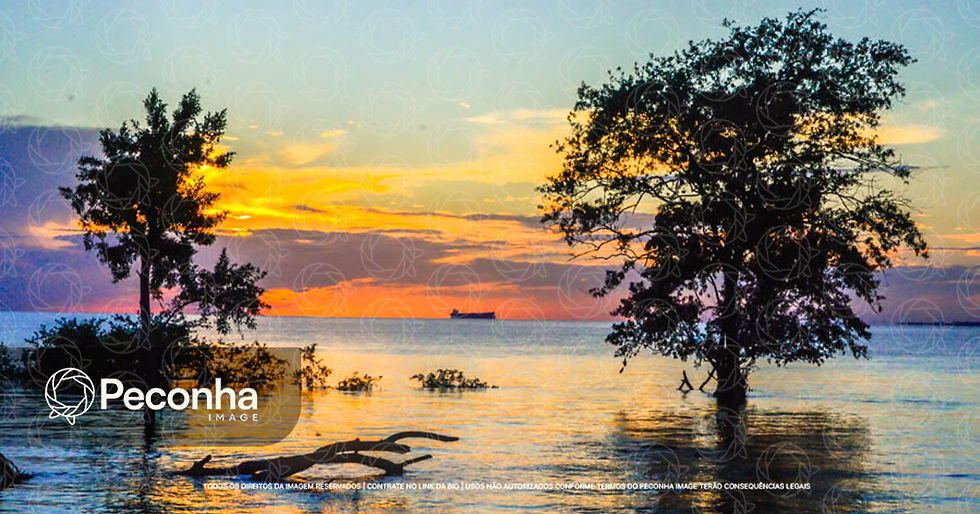 Paisagem aquática ao pôr do sol com cores quentes, árvores submersas em silhueta